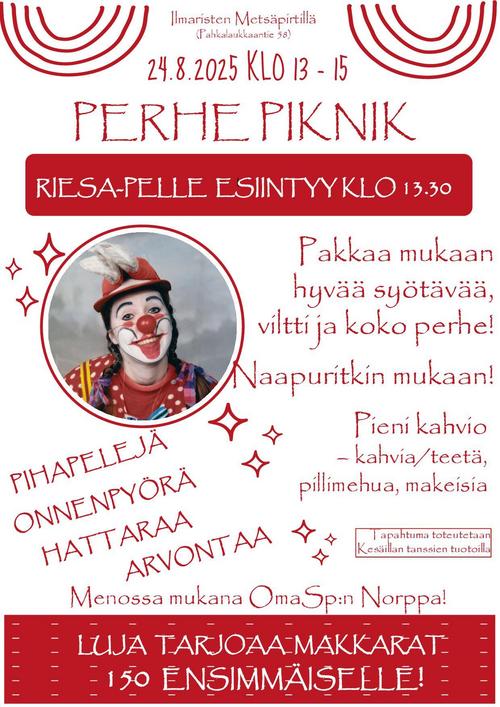 Perhepiknik on iloinen perheiden tapahtuma, jossa tänä vuonna vierailee Riesa-Pelle. Tapahtumassa on pieni kahvio, mutta ota mukaasi perheesi suosimia eväitä. Niitä voitte nauttia joko tanssilavan lattialla viltin päällä tai pihalta löytyvillä pöydillä (rajoitetusti). Lapsille on tarjolla pihapelejä, onnenpyörää, hattaraa ja koko perheelle arvonta kävijöiden kesken.