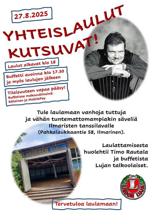 Keskiviikkona 27.8. Timo Rautala laulattaa Ilmaristen tanssilavalla tuttuja yhteislauluja klo 18 alkaen. Klo 17.30 voit tulla nauttimaan iltakahvit buffetista.